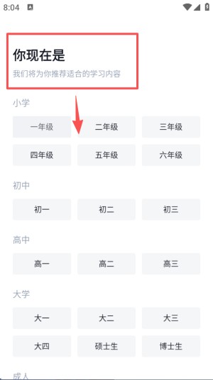 1、首先在 “你现在是” 页面,依据自身所处学段,点击对应年级选项,以便获取适配的学习内容。