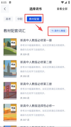 2、接着进入 “选择词书” 页面,切换到 “教材配套” 分类,再选定对应版本,如高中人教版。