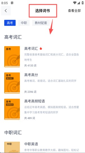 4、最后在 “选择词书” 页面,点击右上角 “查看全部”,即可进入词书的全部分类界面。