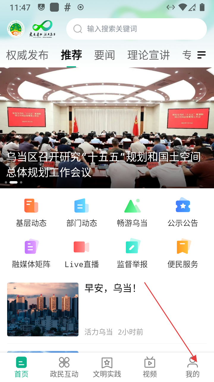 1、打开活力乌当进入首页,点击底部【我的】,进入个人中心界面。