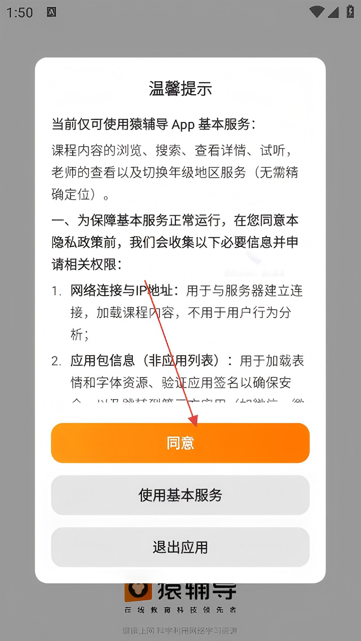 1、打开猿辅导APP,会弹出温馨提示框,点击【同意】,即可使用APP基本服务,如课程浏览、搜索等。