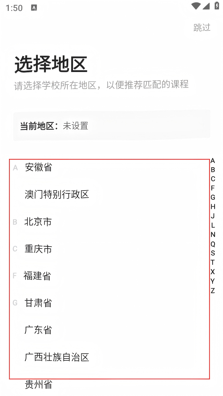 2、接着进入选择地区页面,可根据学校所在地区进行选择,以便APP推荐匹配课程。