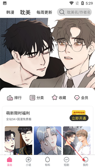 1、进入软件后,可在首页浏览韩漫、耽美等分类漫画,点击【我的】可进入个人中心。