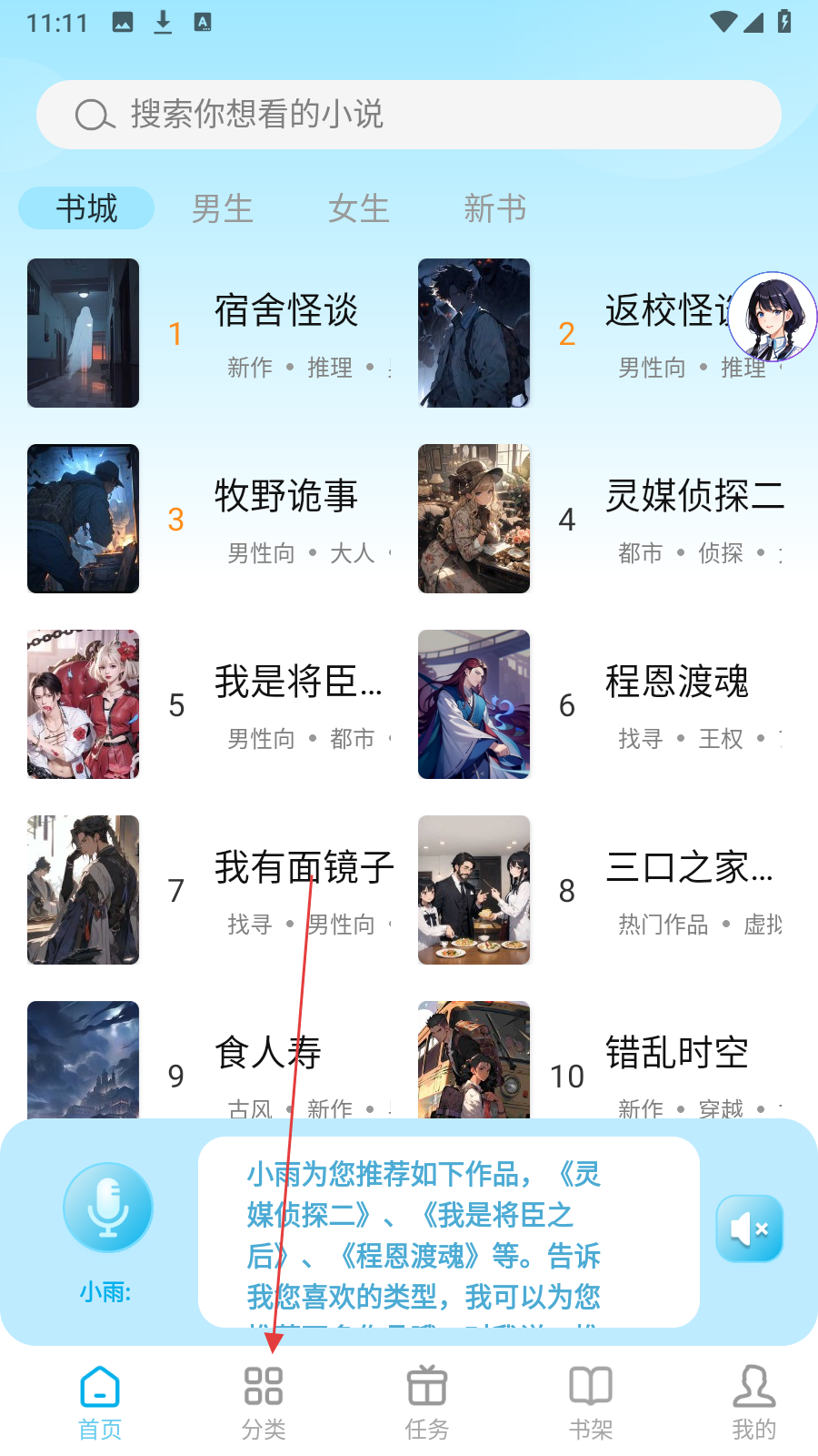 1、在首页底部,点击【分类】进入小说分类界面。