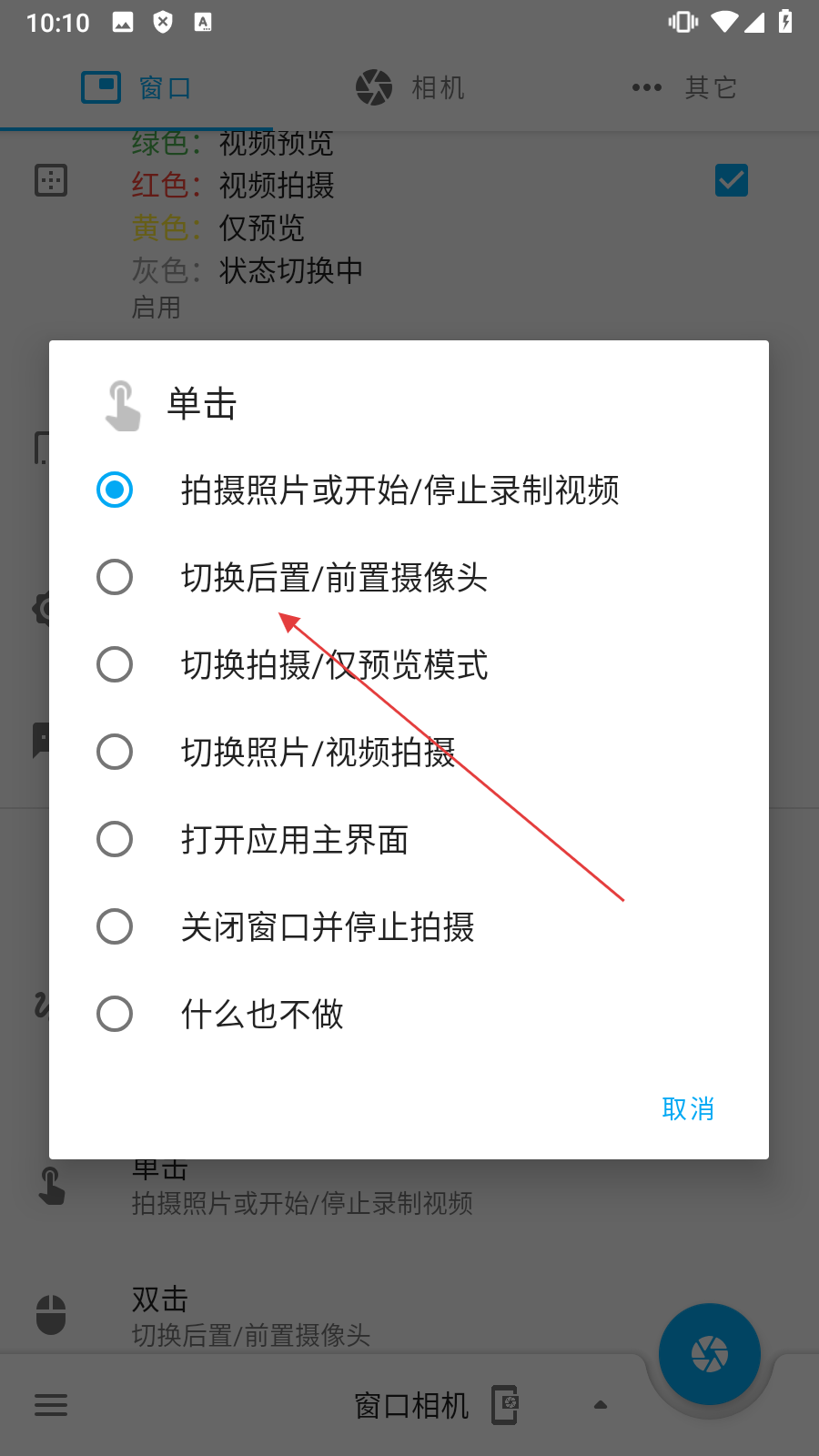 在页面里选择【切换后置/前置摄像头】,就能完成单击功能的设置。