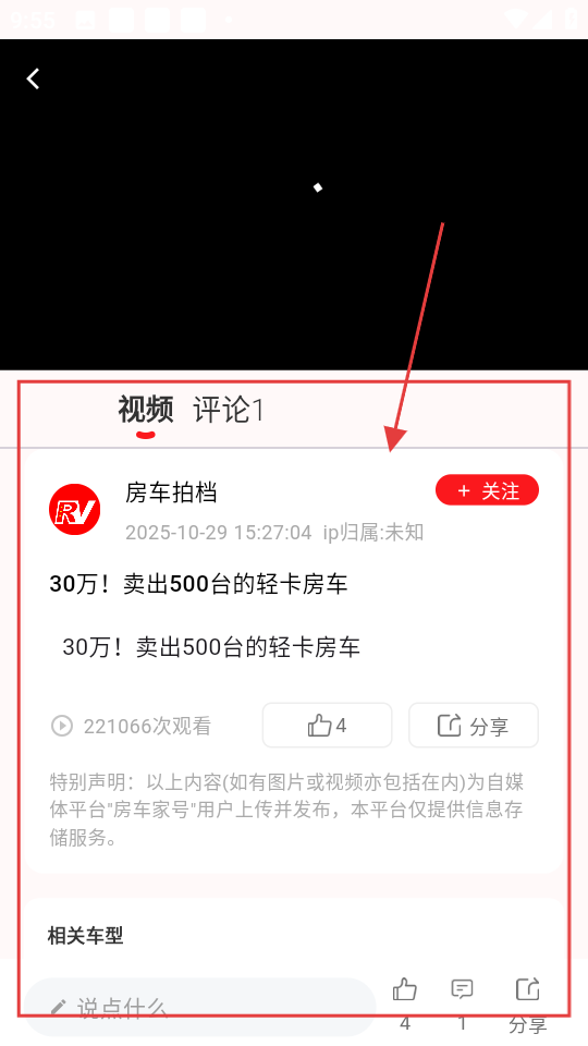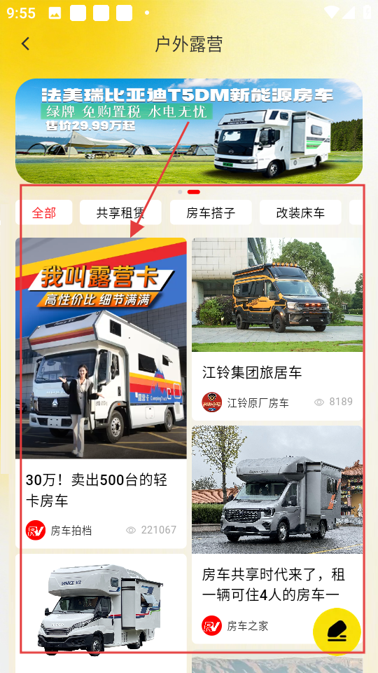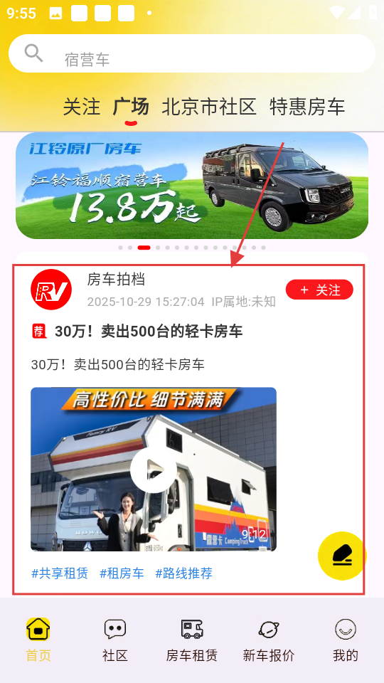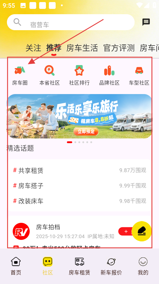 在社区页面,点击【房车圈】就能进入房车圈页面,查看更多房车相关内容。