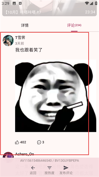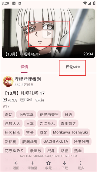 3、进入番剧详情页后,点【评论(234)】选项,就能查看其他用户对这部番剧的讨论和反馈啦。