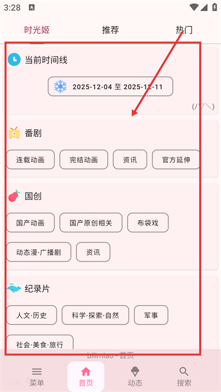 1、在时光姬页面能看到【当前时间线】及番剧、国创等分类,点对应分类标签就能进入对应内容页啦。