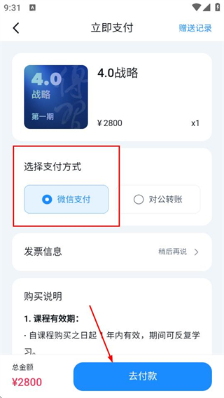 在立即支付页面,选好支付方式后点击去付款按钮,就能完成课程购买。