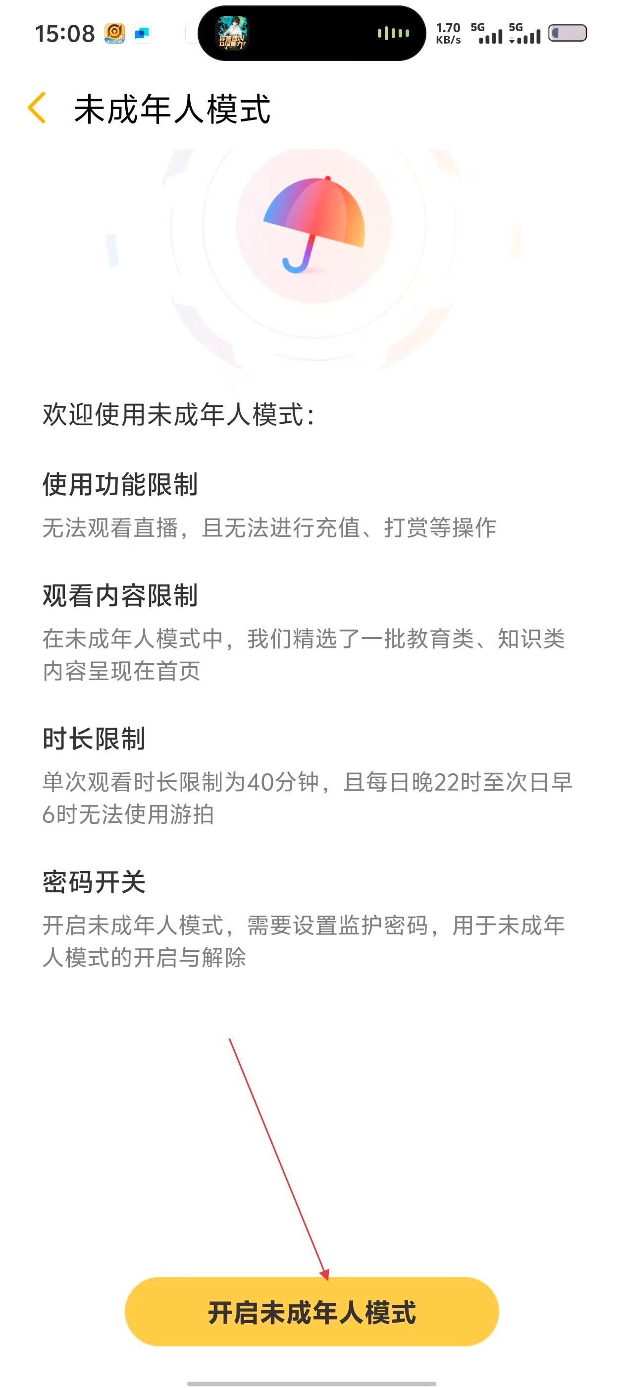 4、在未成年人模式页面,点击【开启未成年人模式】按钮,可开启该模式,此模式有功能、内容等多方面限制。