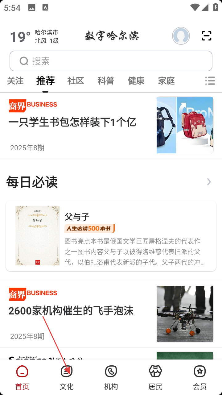 1、打开【数字哈尔滨】APP,点首页底部【文化】进文化服务页。