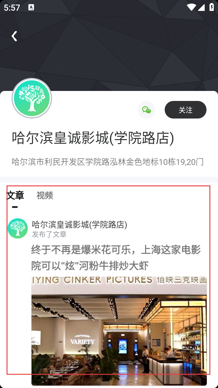 4、在影院详情页,浏览【文章】【视频】板块,了解动态特色。
