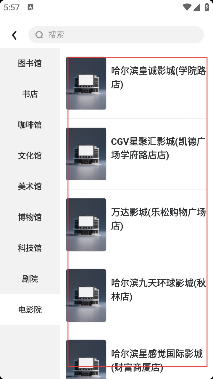 2、在文化页,点【电影院】分类,查看哈尔滨影院列表 。