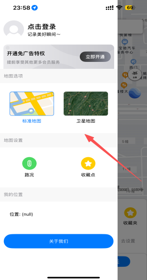 4、点“登录”享免广告特权,再选卫星地图与路况让导航更精准。