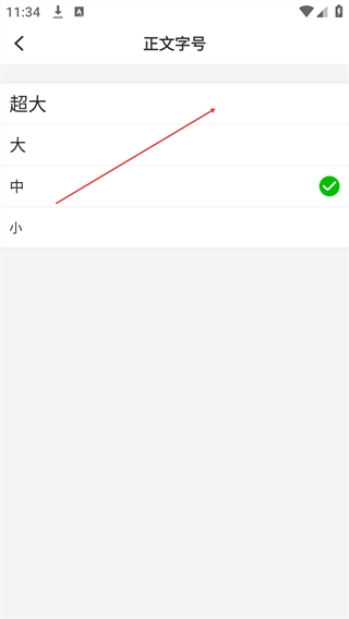 4、在正文字号页面,选择“超大”“大”“中”“小”任一选项(当前默认“中”),完成字号调整。