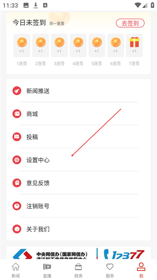 2、在个人中心,点击【设置中心】选项,进入设置界面。