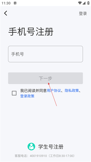 在手机号注册页面,输入手机号并勾选同意协议后,点击【下一步】即可进入设置密码页面。