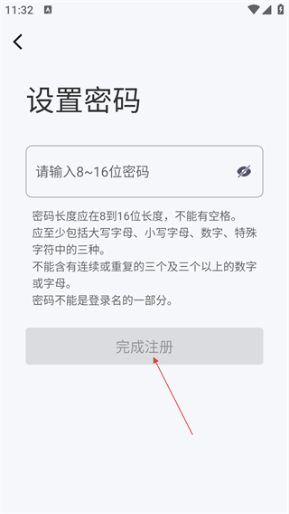 在密码设置页面,输入满足要求的密码后,点击【完成注册】按钮即可完成账号注册流程。
