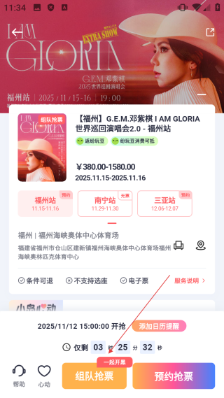 在演出详情页面,点击【组队抢票】按钮,就能完成组队抢票的操作。