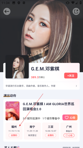 在艺人详情页面点击【目标演出城市】,即可进入对应演出的详情界面。
