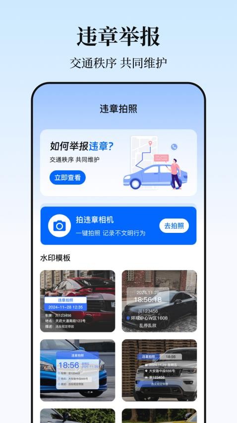 用户也能在线拍摄车辆违章情况,借助水印拍照功能来记录相关信息。