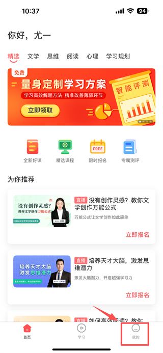 打开教育类应用,点击底部的“我的”选项,即可进入个人中心页面。