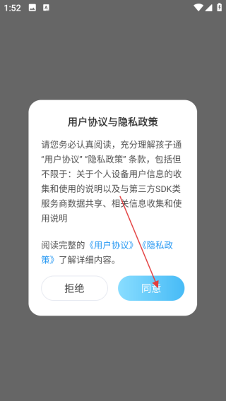 1、打开应用,首次进入需阅读【用户协议与隐私政策】,确认后点击【同意】。