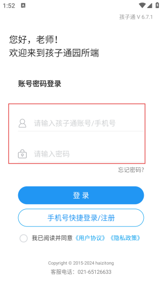 2、在【账号密码登录】界面,于对应输入框填入【孩子通账号/手机号】及密码。