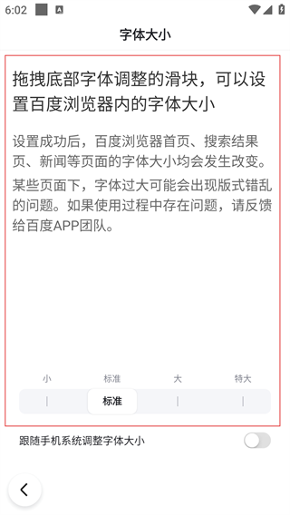 4、在【字体大小】设置页,拖动滑块可调整百度浏览器内字体,可选【小-标准-大-特大】,设置后页面字体同步变化。