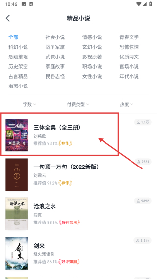 在精品小说书籍列表页面,找到并选择《三体全集》(全三册),然后进入该书籍的详情页面。