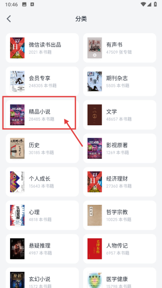 在分类页面,点击“精品小说”分类标签,即可进入精品小说书籍列表页面。