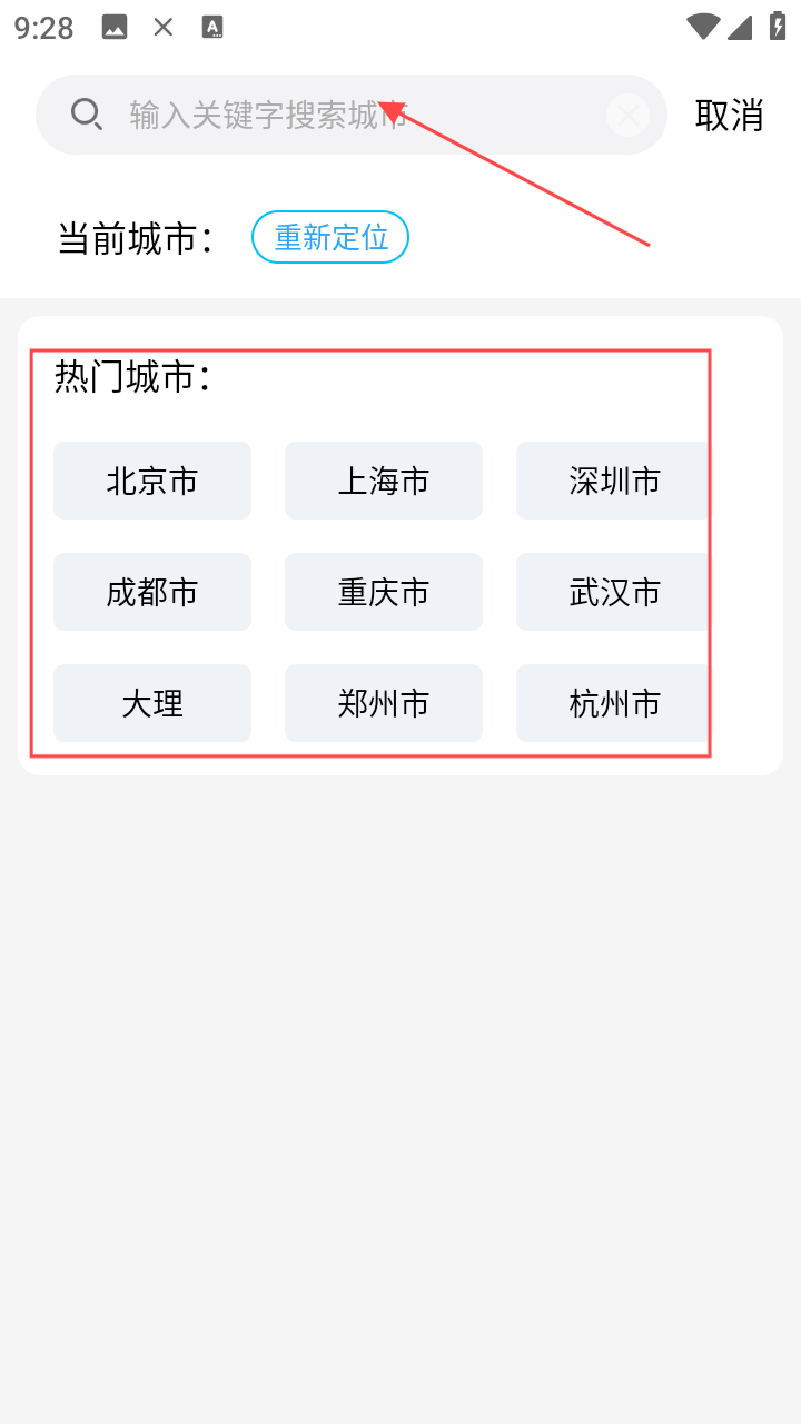 4、在搜索/选择页,通过搜索栏输城市名或选热门城市,添加目标城市。