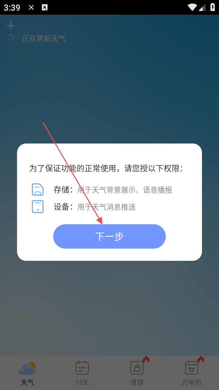 1、打开应用,弹出权限申请提示,点【下一步】,按指引授予存储、设备权限。