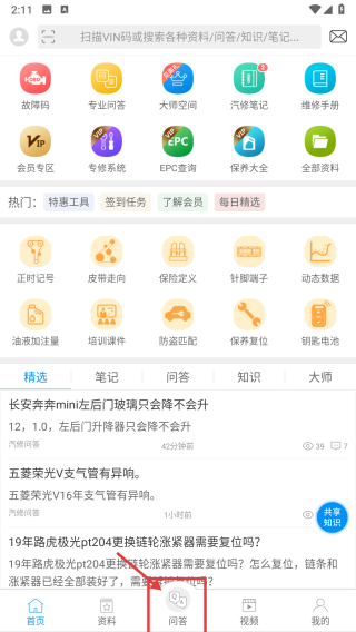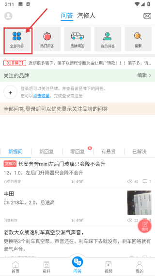 进入汽车维修分类,点击底部的问答选项,即可进入问答页面。