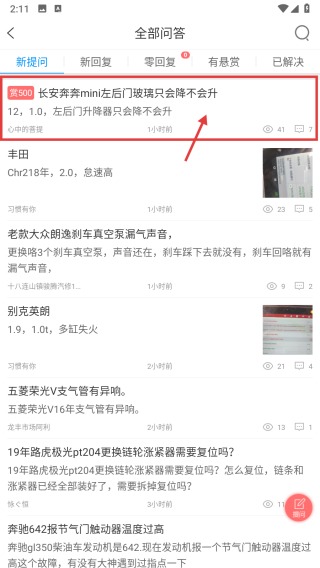 在所有问答列表页面,找到关于长安奔奔mini左后门玻璃仅能下降无法上升的问答内容,点击进入该专业问答的详情页面。