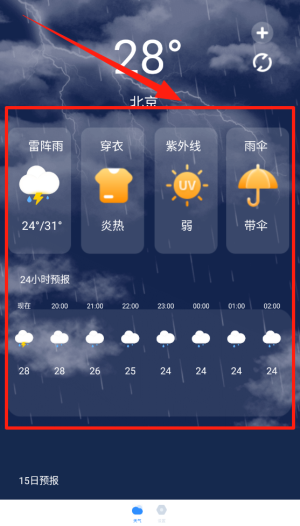 1、24小时预测,随时查看未来24小时的天气变化,湿度,风速等重要的数据,便于出行规划。