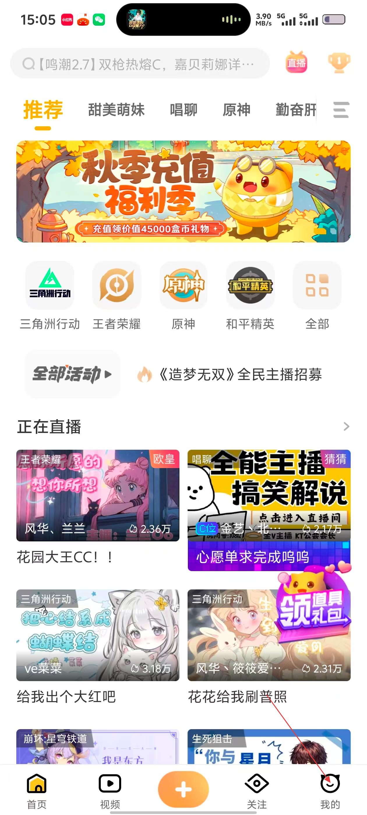 1、首页有【秋季充值福利季】活动,还有《三角洲行动》《王者荣耀》等游戏入口,以及正在直播的内容,可根据喜好选择。