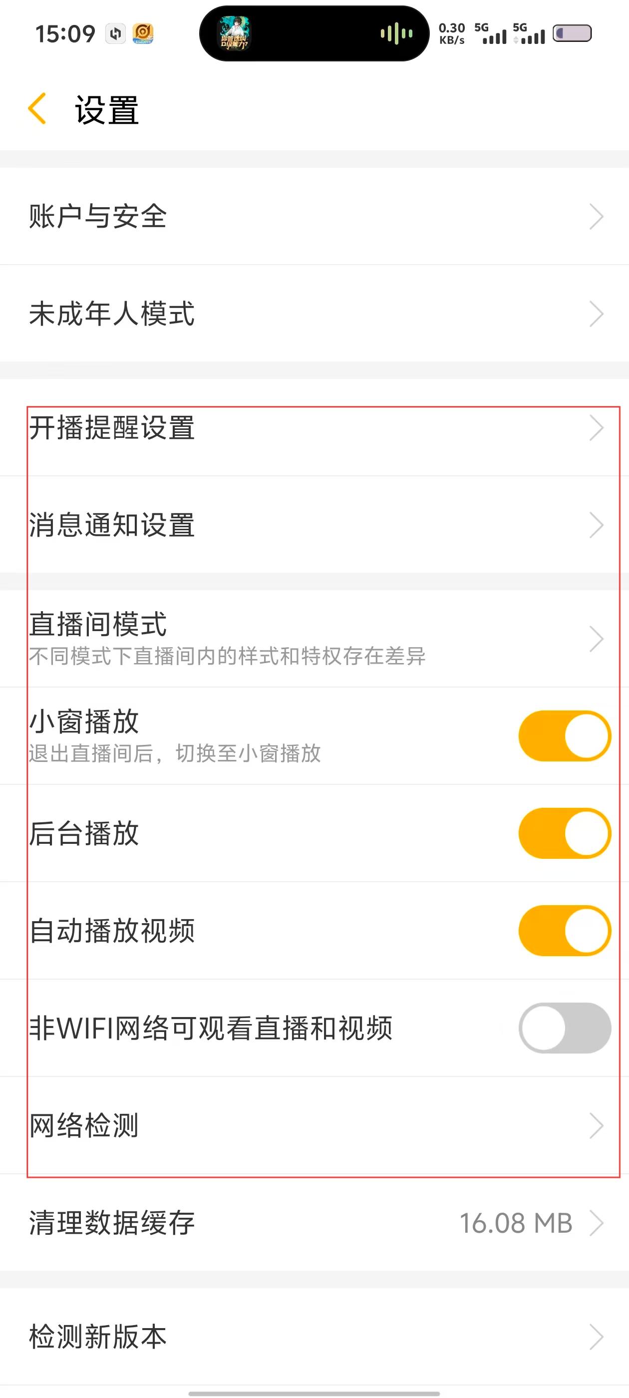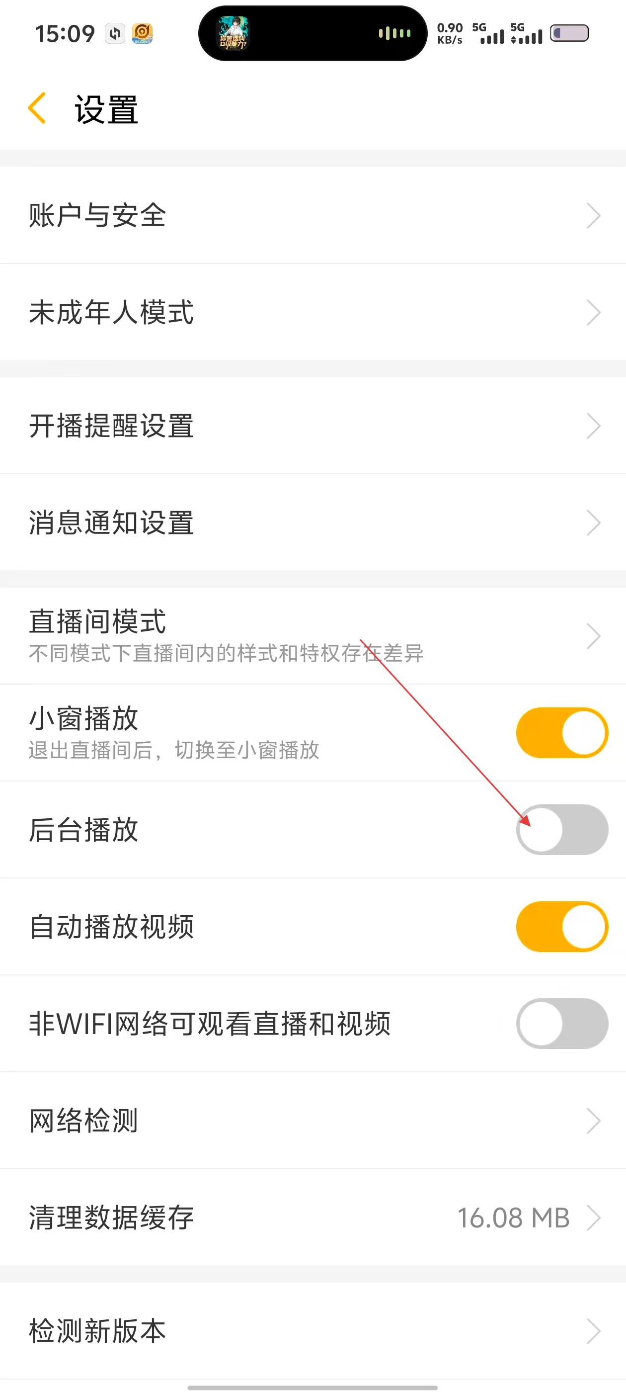 3、在设置页,有【账户与安全】【未成年人模式】等选项,在设置页找到【后台播放】开关,点击开启。