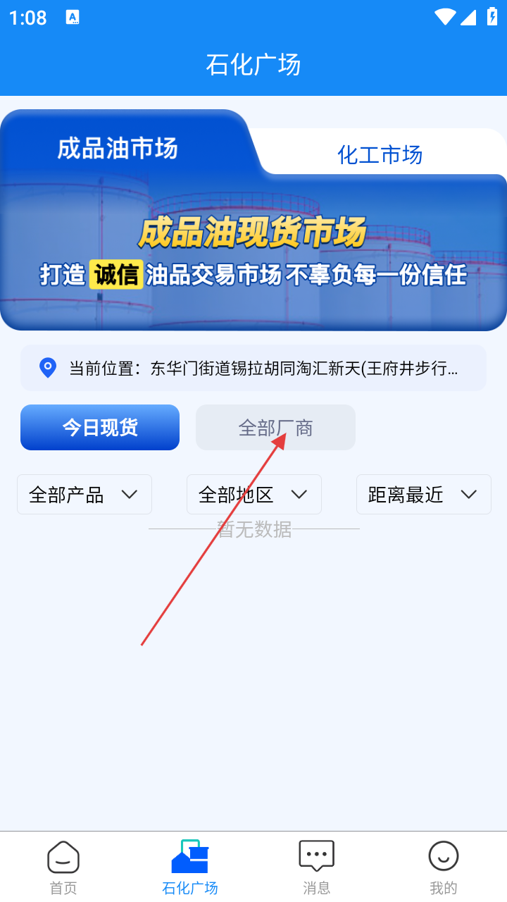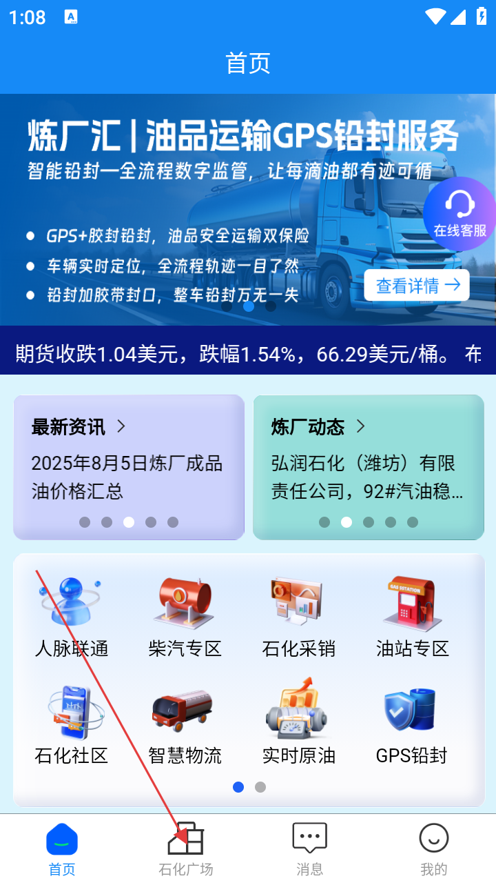 1、在首页点击【石化广场】,进入油品交易市场界面。