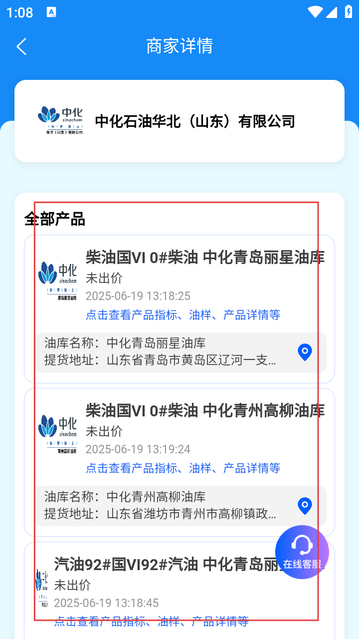 4、在商家详情页,浏览产品及油库、提货地址等信息。