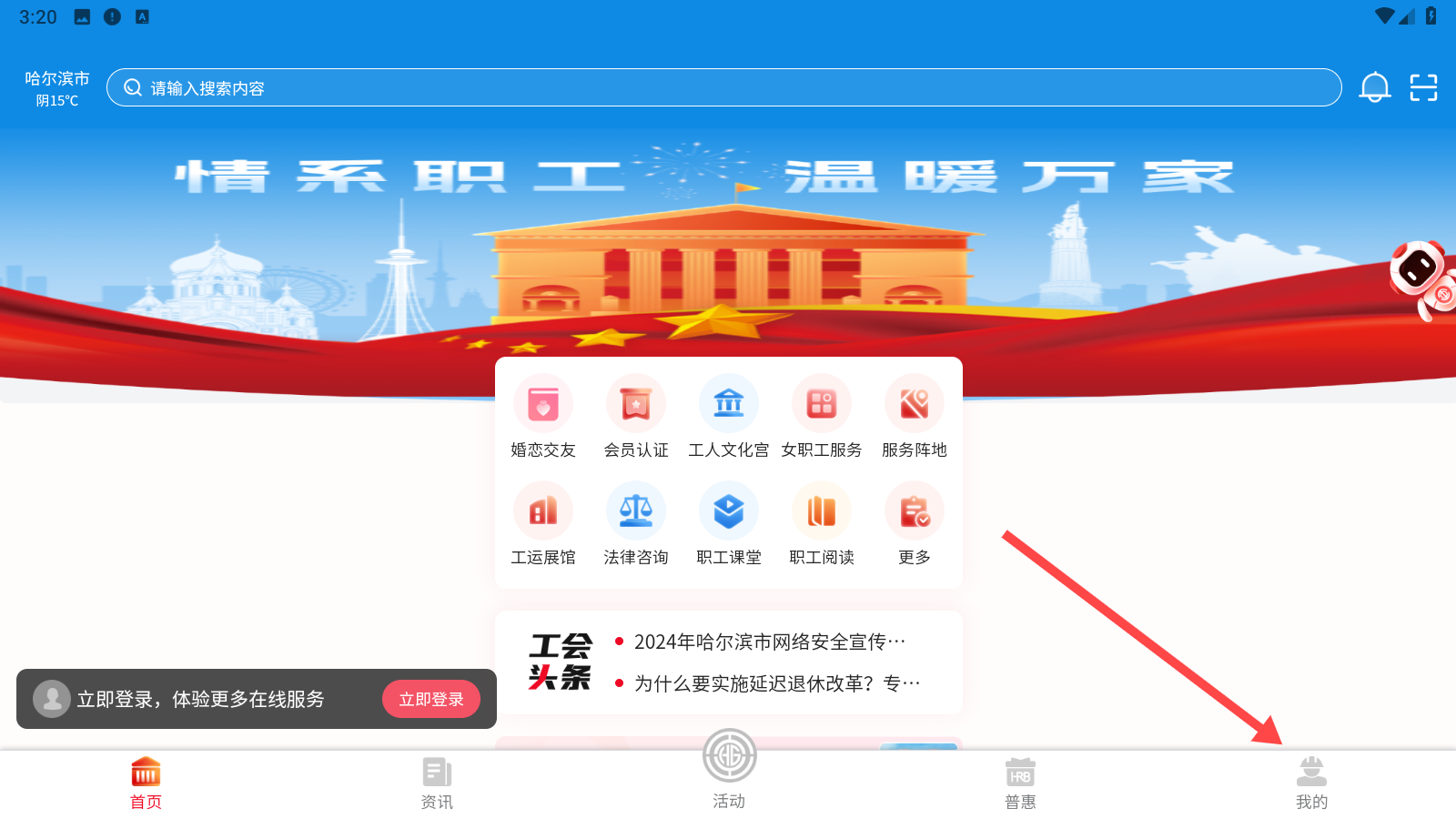 智慧哈工是哈尔滨市总工会专为本地职工打造的一站式网上服务平台。平台设置首页、资讯、活动、普惠、我的五大板块,涵盖会员认证、法律咨询、职工课堂等十余项功能,实现职工服务线上一键操作。通过智慧哈工,职工不仅能便捷获取工会资讯、参与技能培训,还能享受购物优惠、生日福利等普惠服务。平台定期上线各类活动,发放优惠券、消费券,以丰富的福利提升职工生活品质,是职工享受工会关怀、拓展生活服务的得力助手。