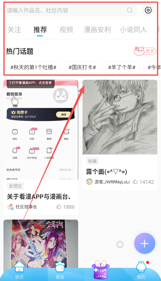 然后呢,回到首页浏览内容,顶部有搜索框可以输入作品名或社区内容进行查找,中间区域是每日推荐的热门漫画。