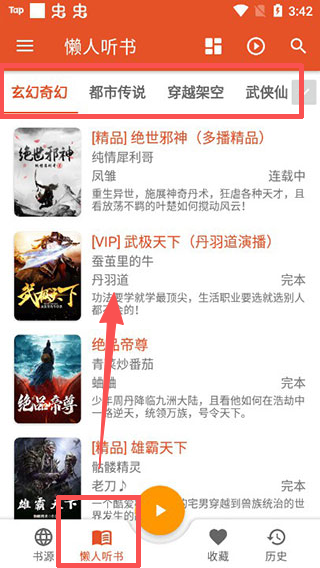 3、切换到具体书源页面,在 “玄幻奇幻” 等分类下,选择想听的书籍,进入音频播放界面。