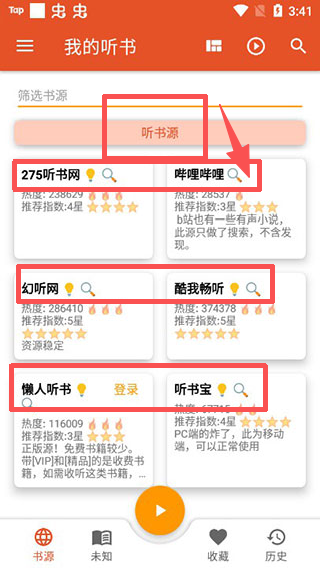2、选择听书源后,在展示的书源列表里,挑选心仪的平台,进入对应的听书资源页面。