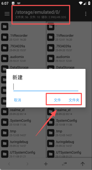 3、返回文件列表长按目录,点“新建”可随意创建文件或文件夹。