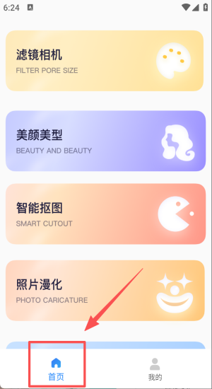 1、打开秒简相机首页,点选滤镜、美颜、抠图或漫化进入对应功能。