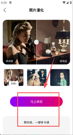 3、切换照片漫化点“马上体验”,一键生成前后对比卡通形象。