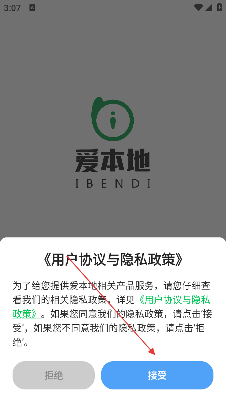 1、首次打开应用,弹出用户协议弹窗,点【接受】进入登录注册页。