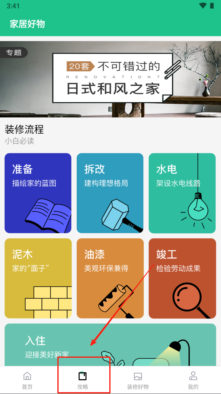 2、查看攻略学习装修流程。点击“攻略”图标,学习装修的各个阶段和流程。