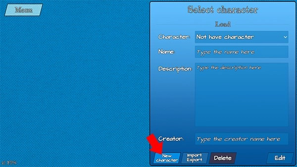 进入下图所示界面后,点击下方的“New character”选项即可创建新角色(若有需要,也可通过“Import/Export”功能导入或导出角色)。